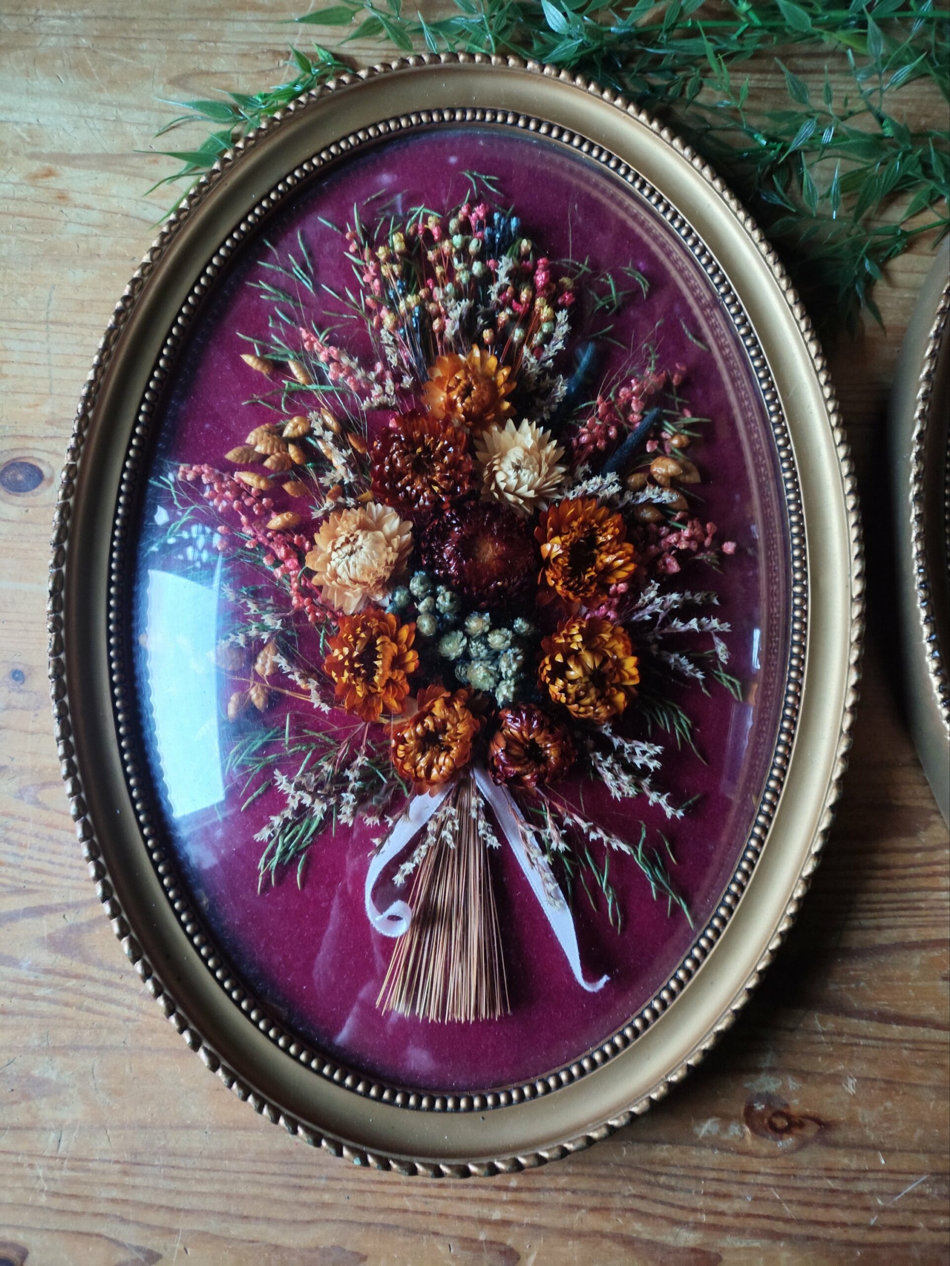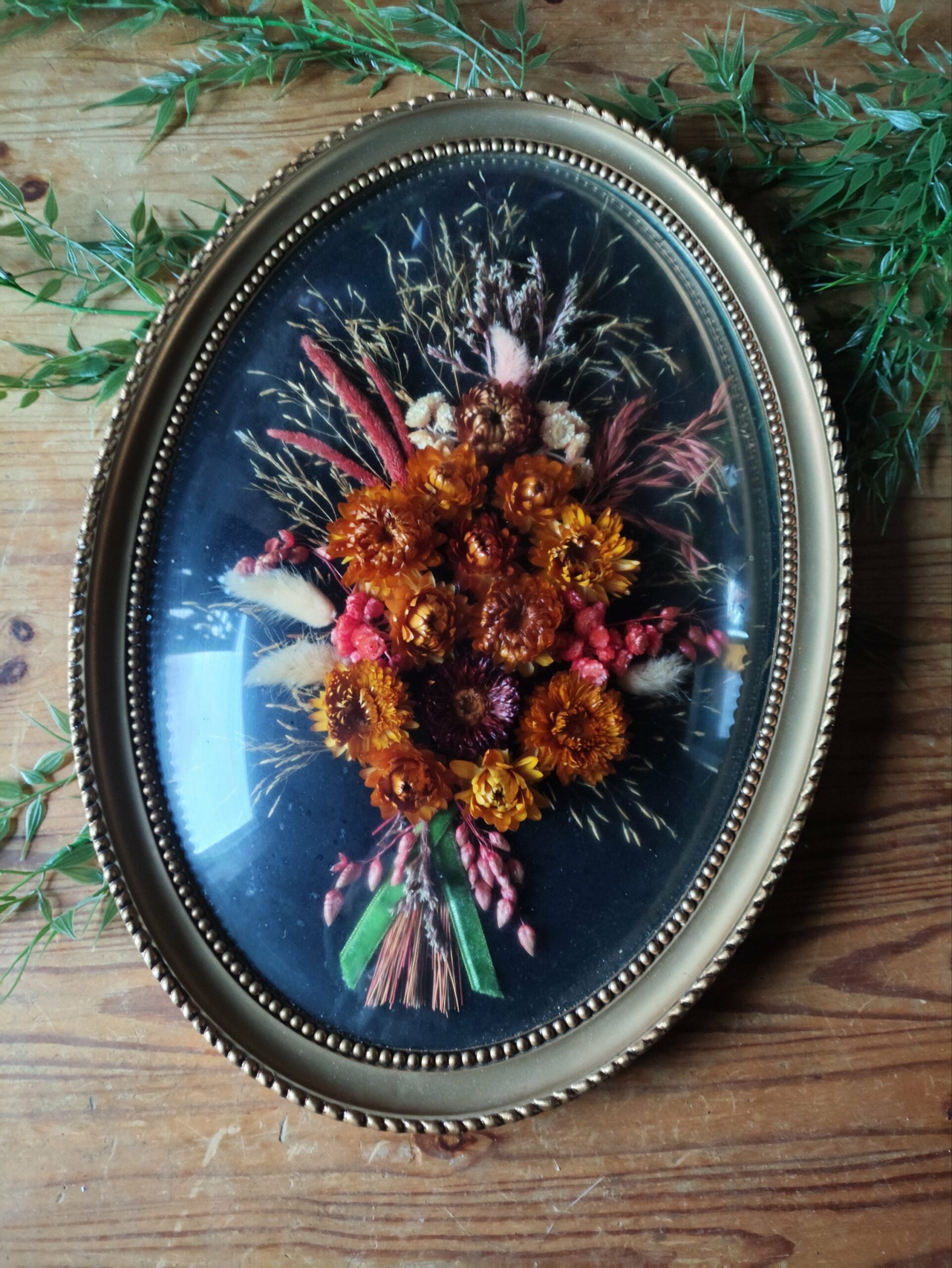 Cadre bombé avec un bouquet de fleurs séchées sur un fond marron et un encadrement doré. Jolie camaïeu de couleurs automnales pour cet objet de décoration murale plein de charme.