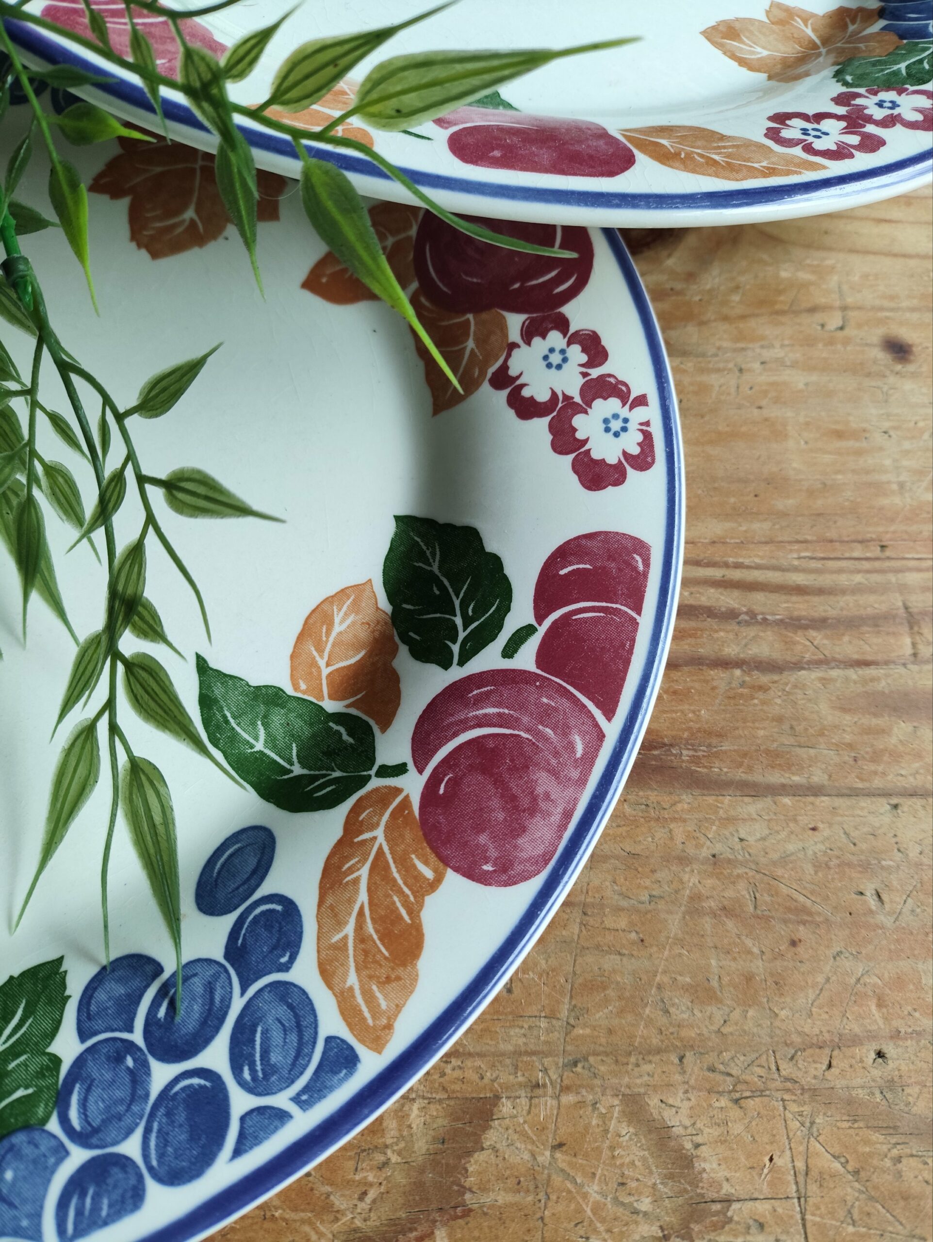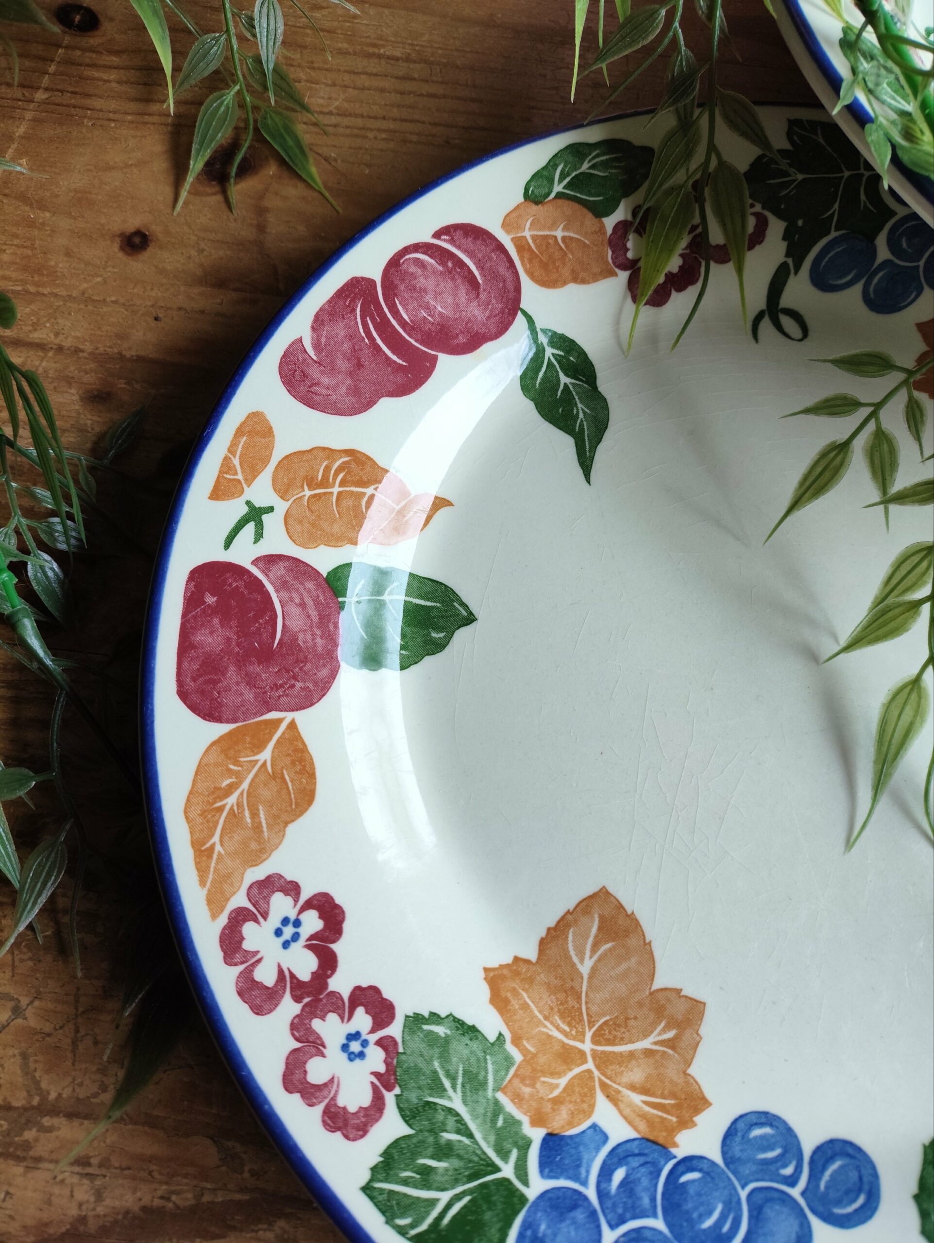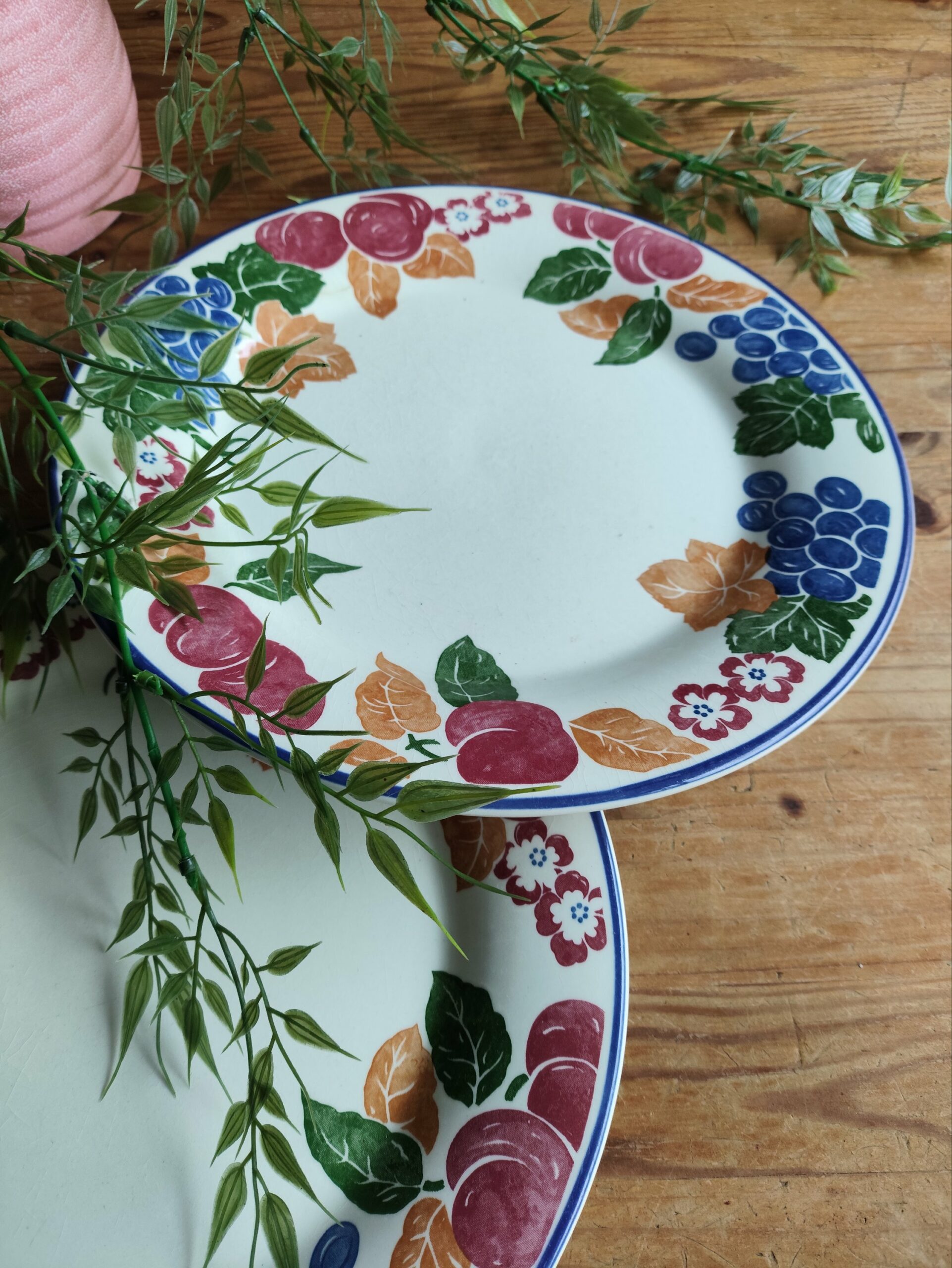 Duo de jolies assiettes plates en céramique Made in England avec un contour végétal composé de fruits multicolores.