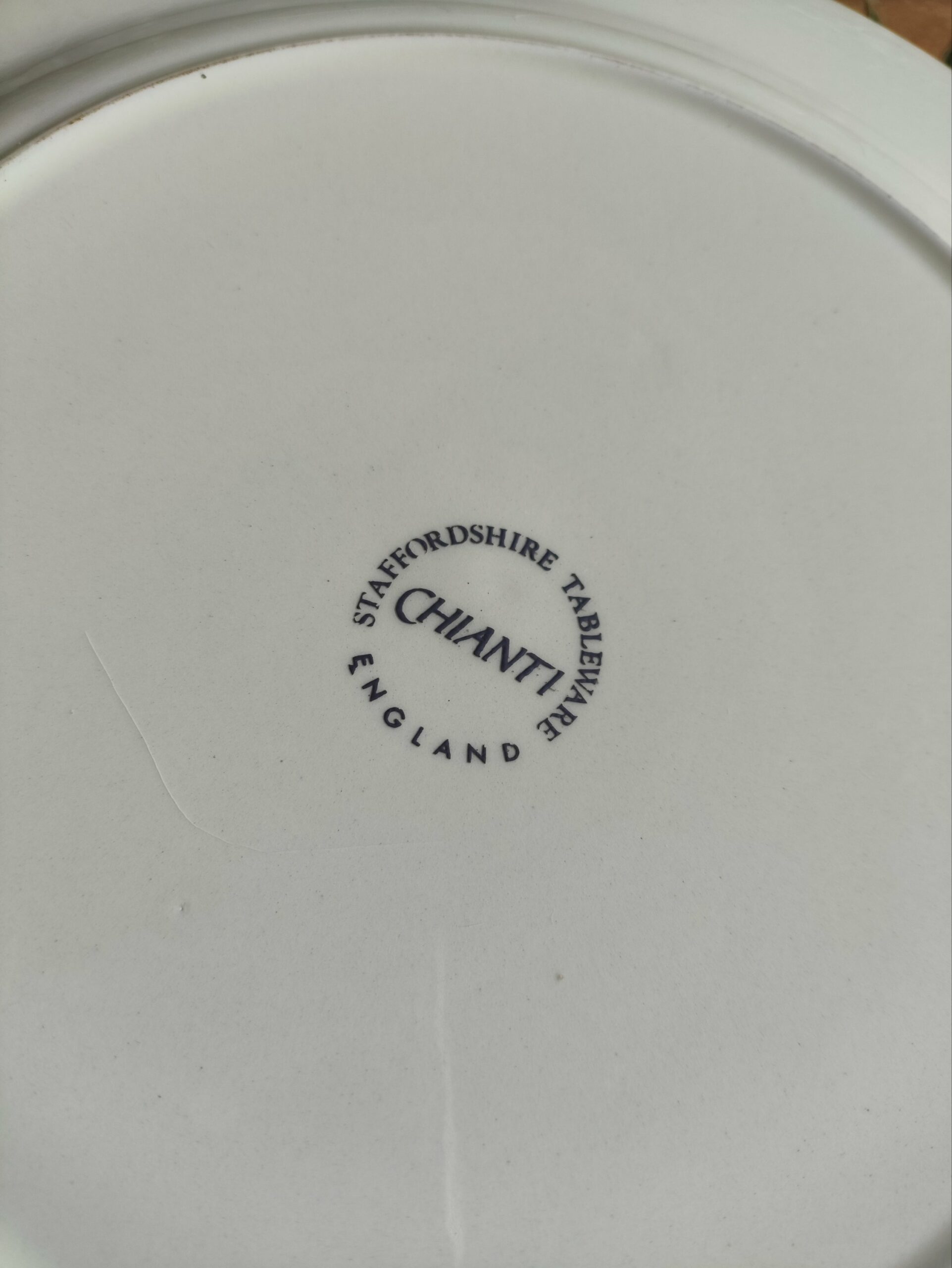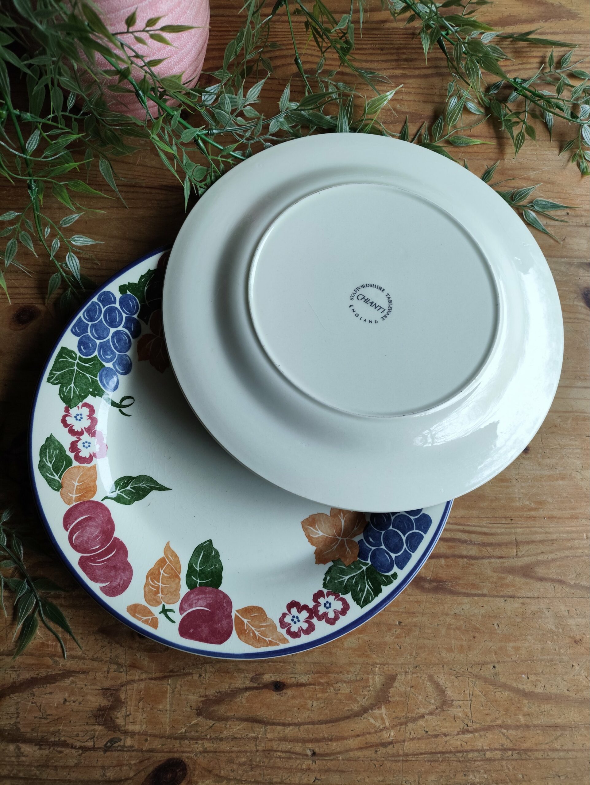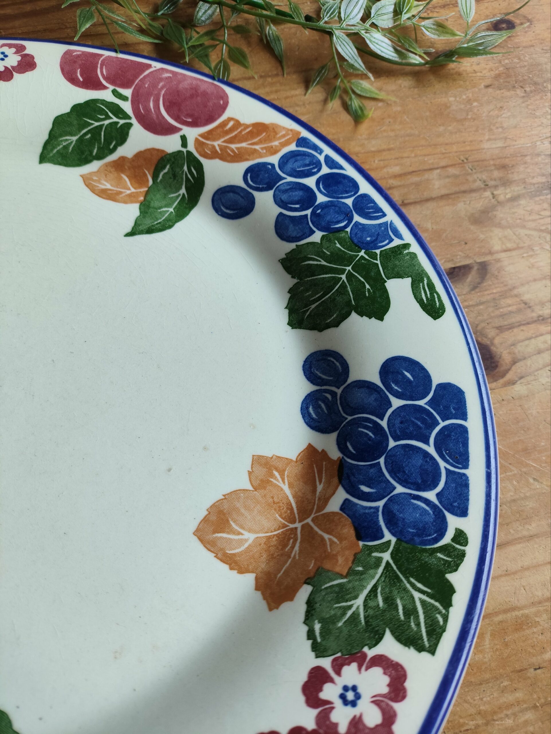Duo de jolies assiettes plates en céramique Made in England avec un contour végétal composé de fruits multicolores.