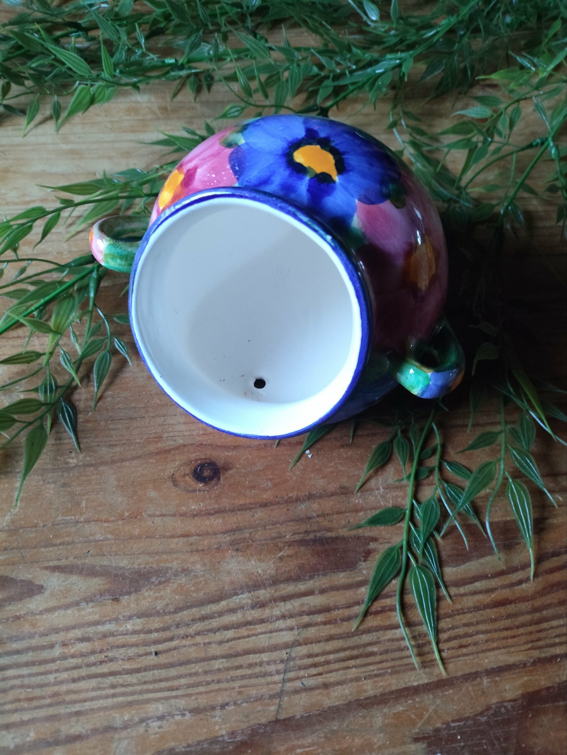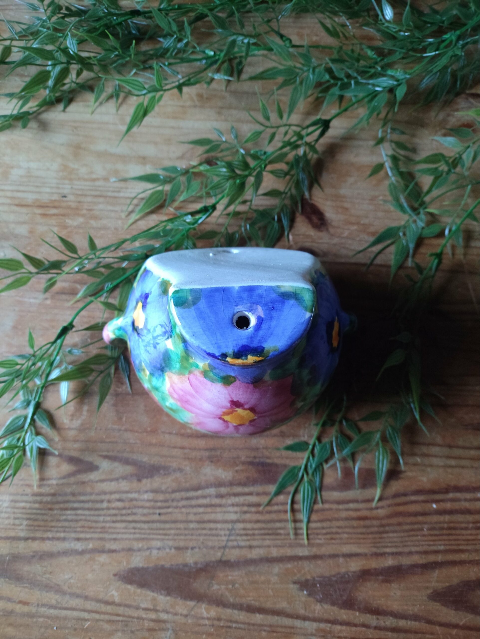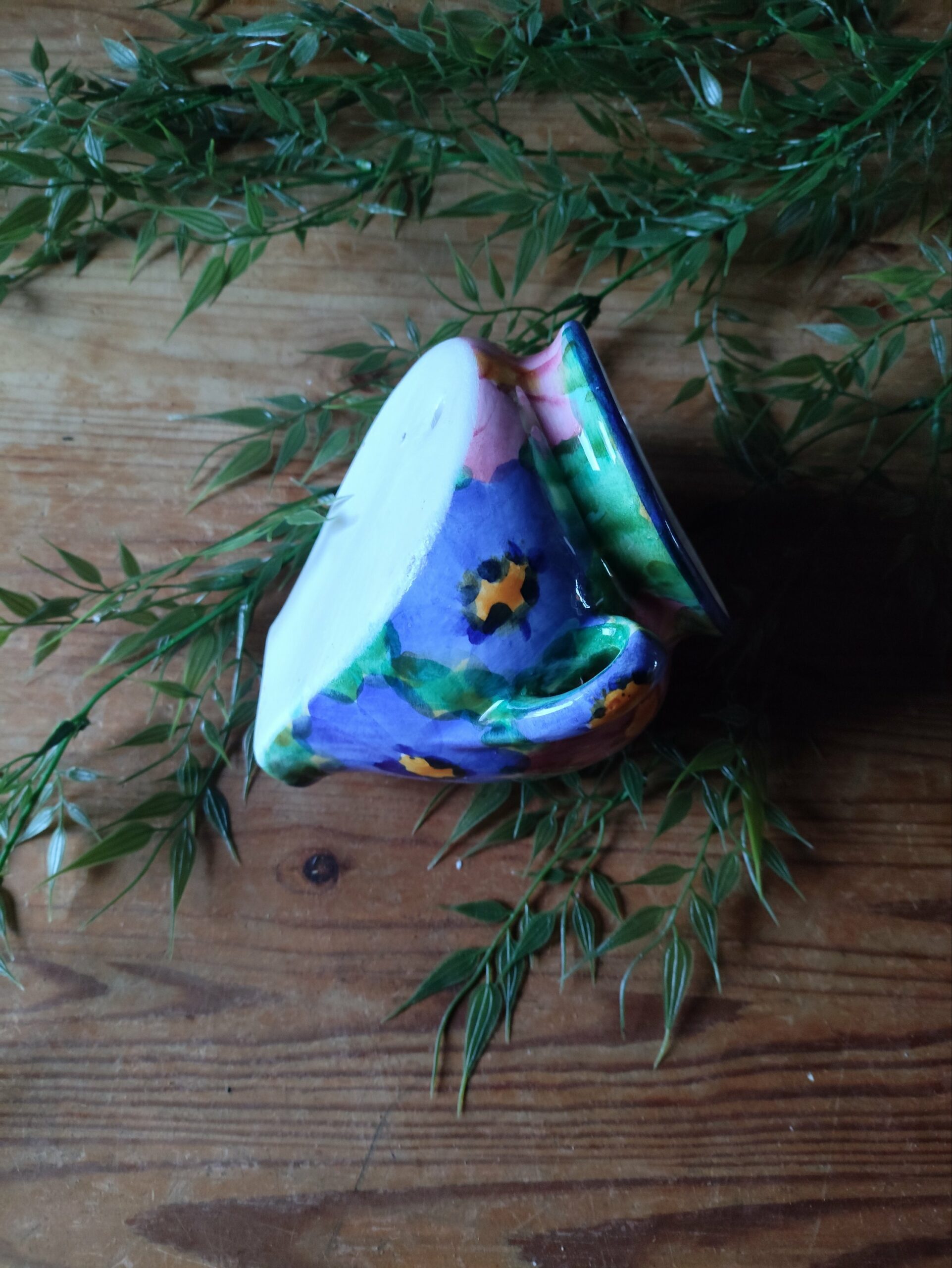 Petit pot jardinière murale en céramique avec un motif fleuri multicolore. Style provençal avec de jolies fleurs rose et bleu.