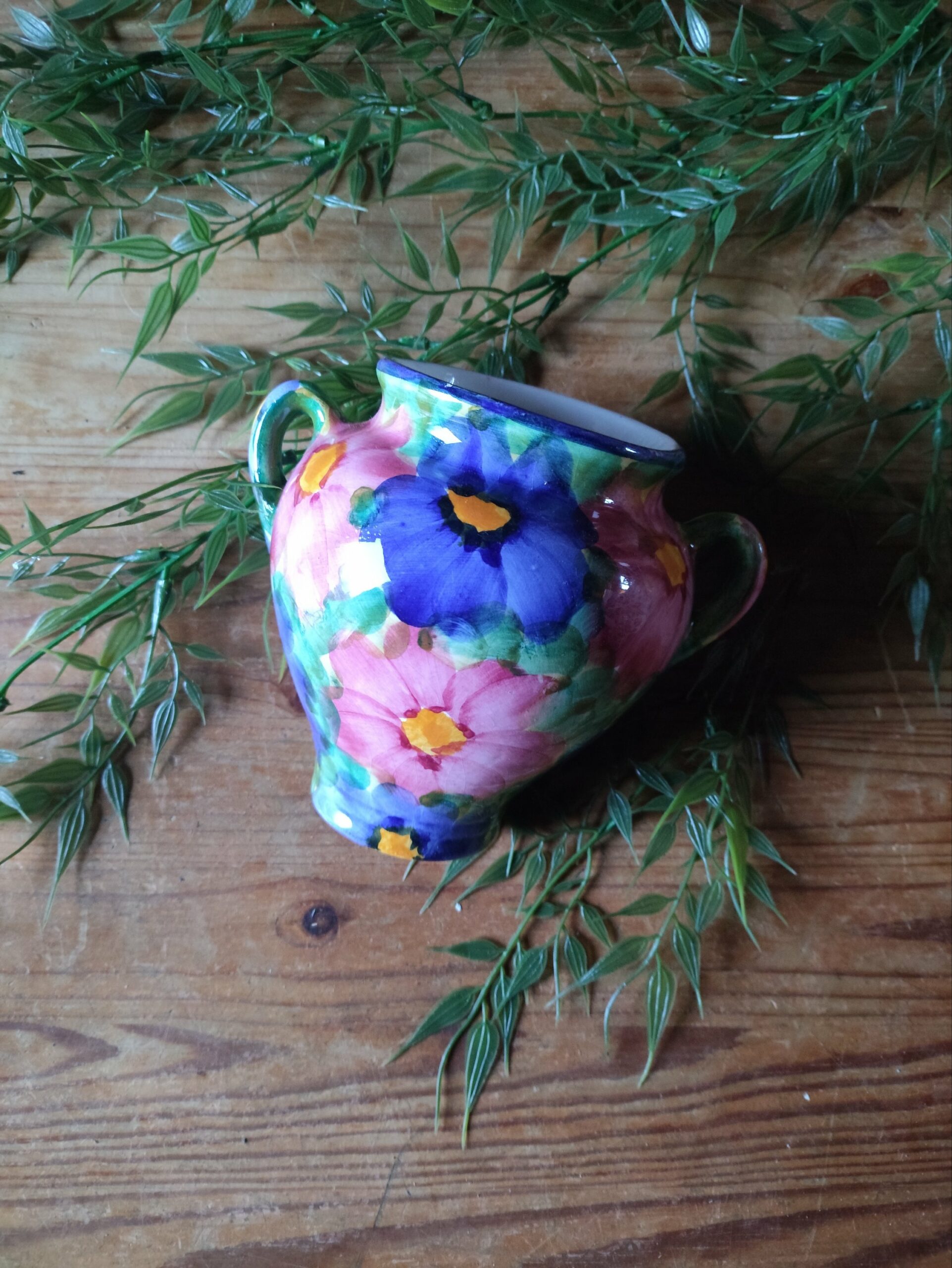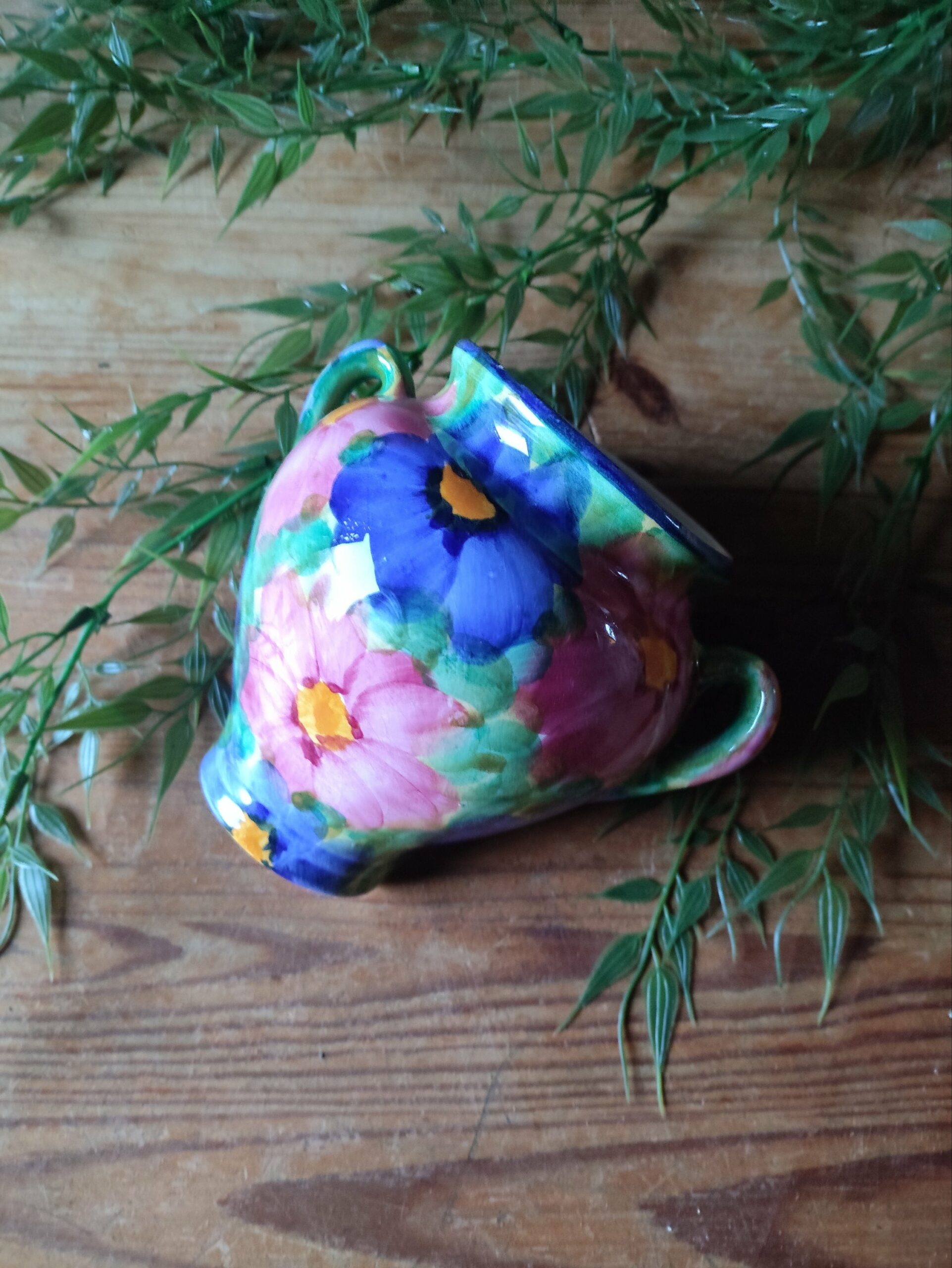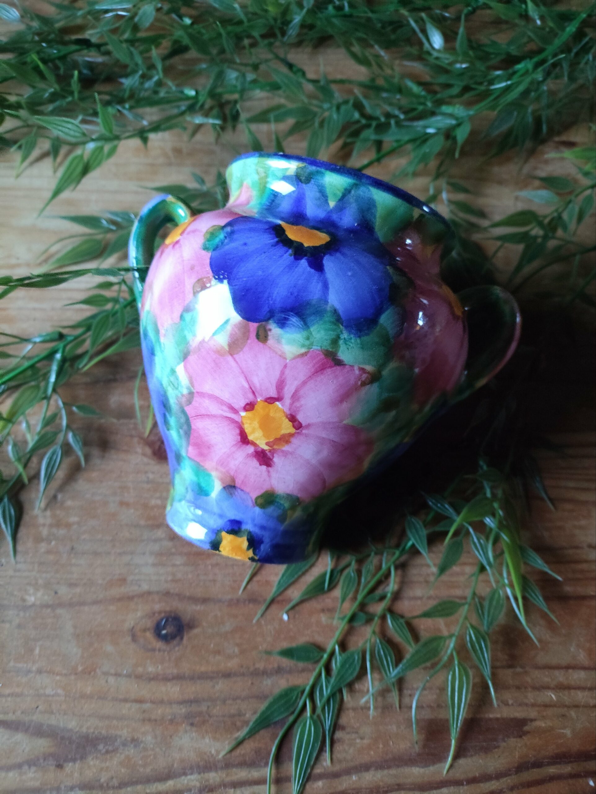Petit pot jardinière murale en céramique avec un motif fleuri multicolore. Style provençal avec de jolies fleurs rose et bleu.