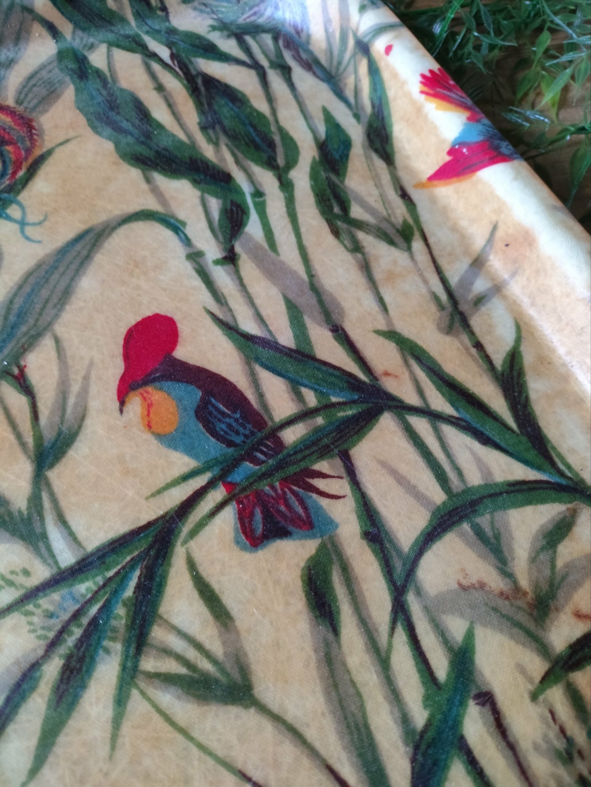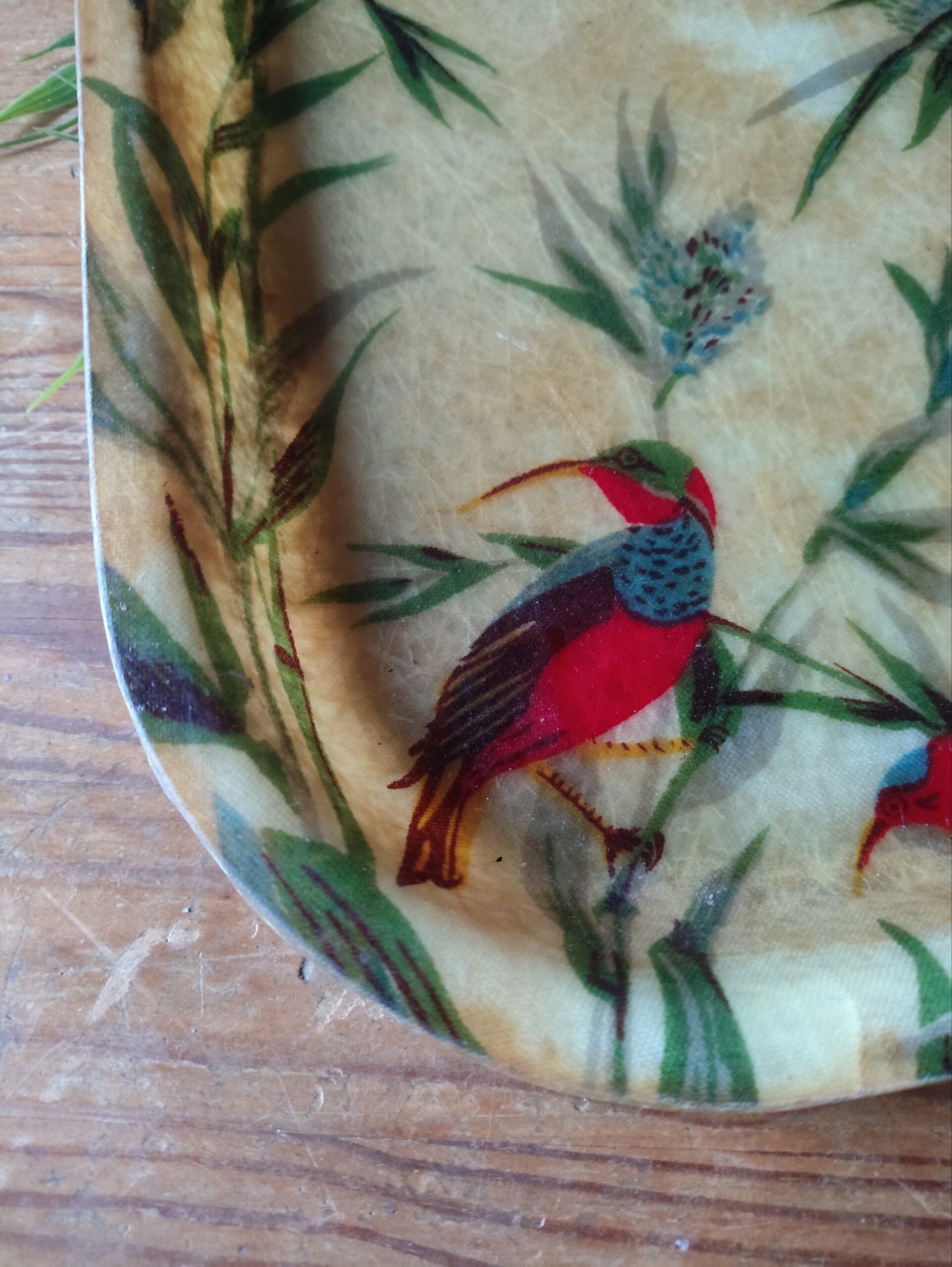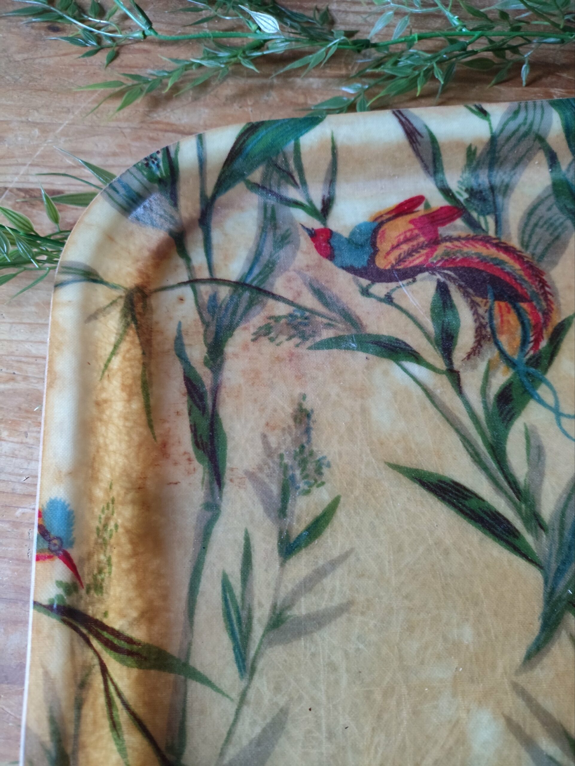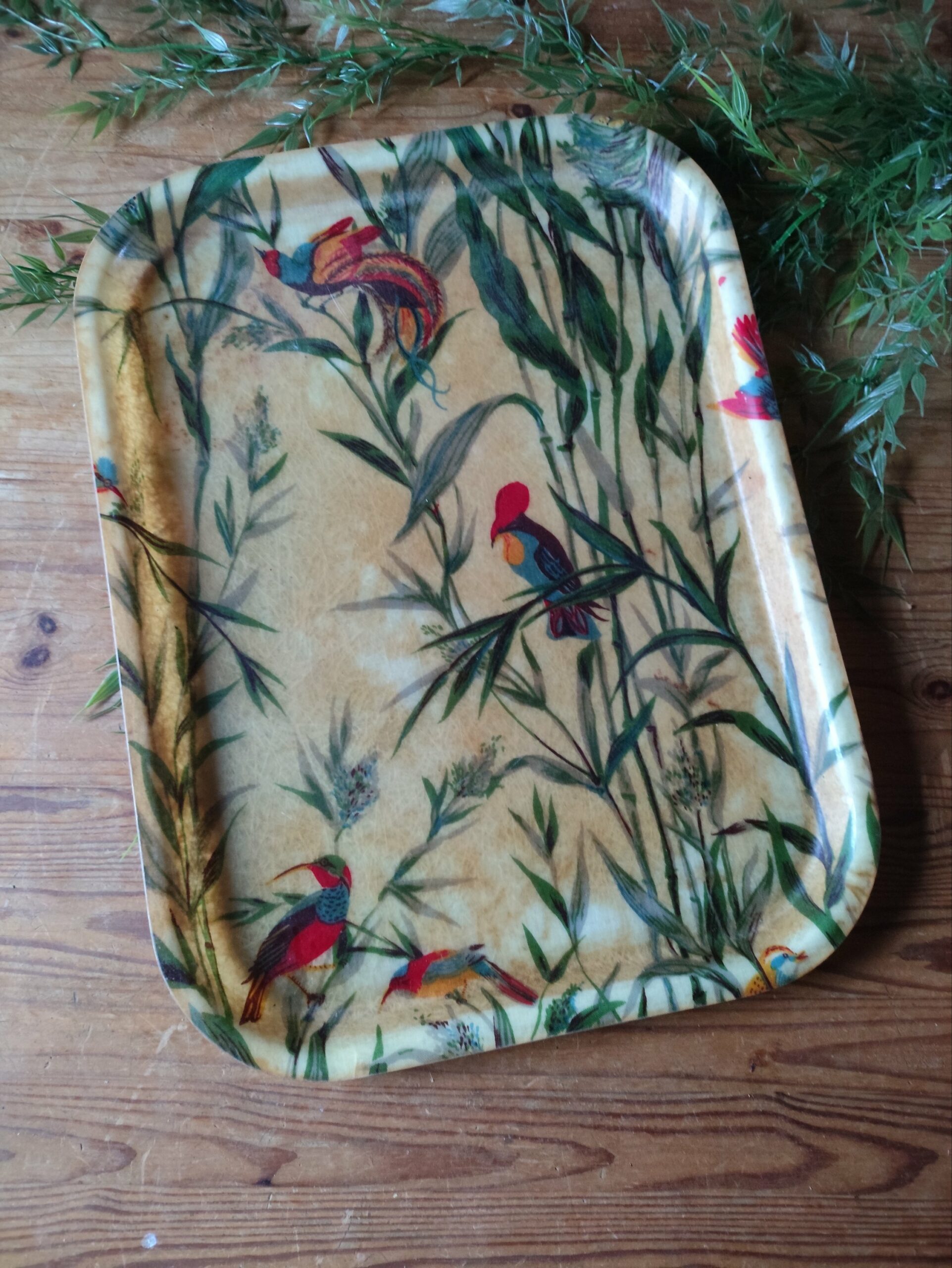 Plateau en fibre de verre beige jauni avec un motif végétal jungle et des oiseaux multicolores.