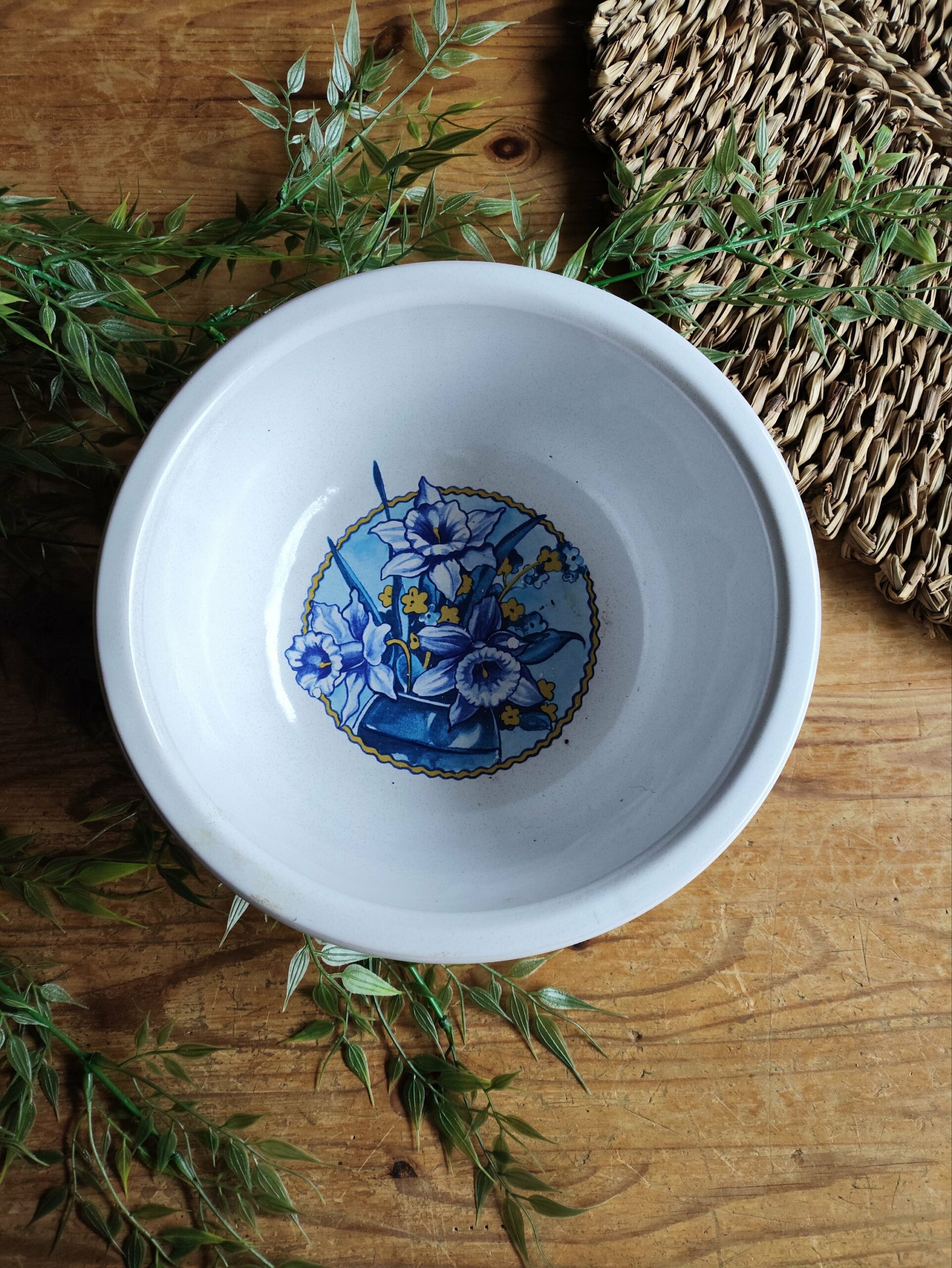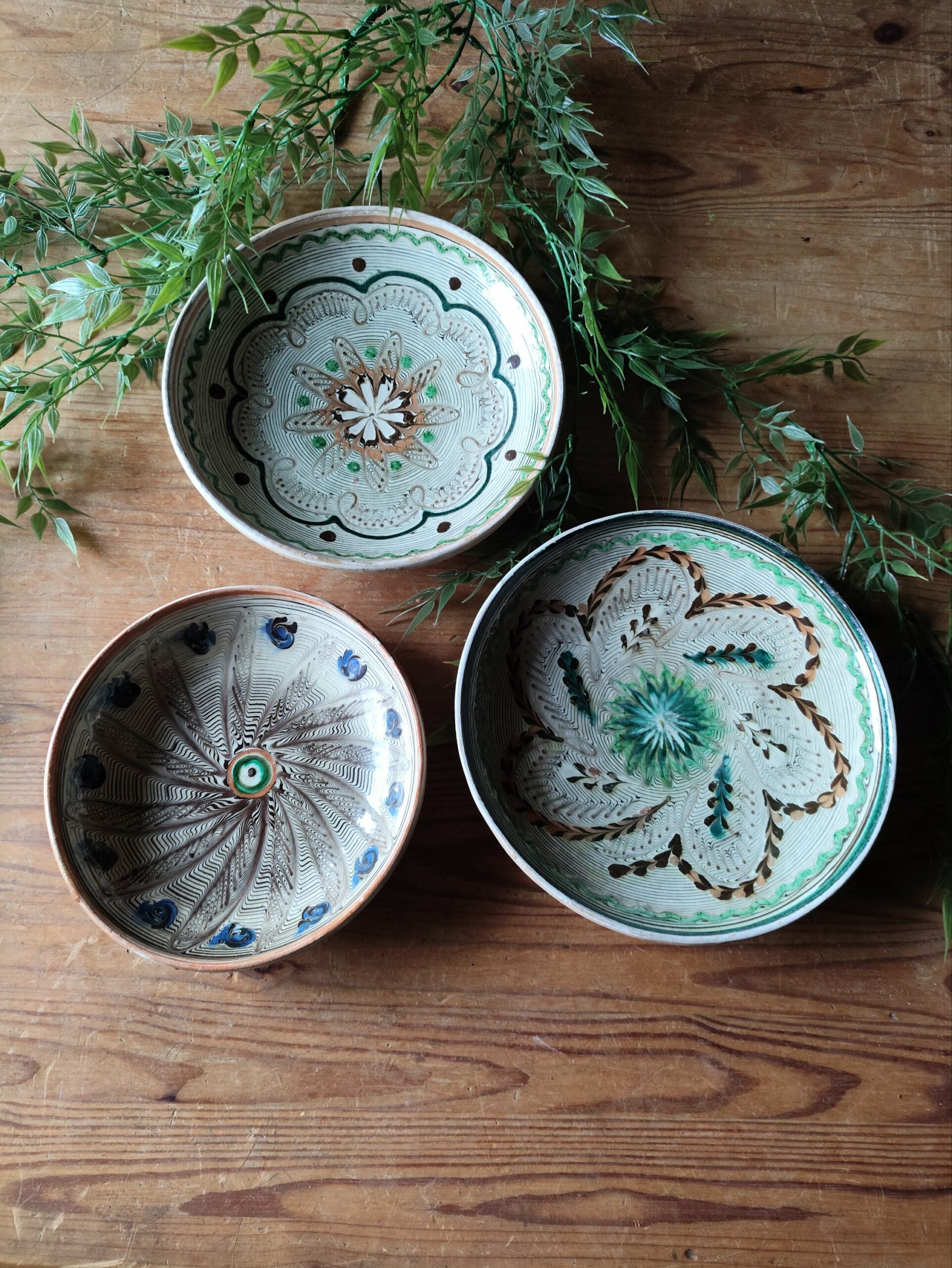 Présentoir en céramique à deux niveaux en format assiettes à dessert, en forme de feuilles dans un dégradé jaune/vert.