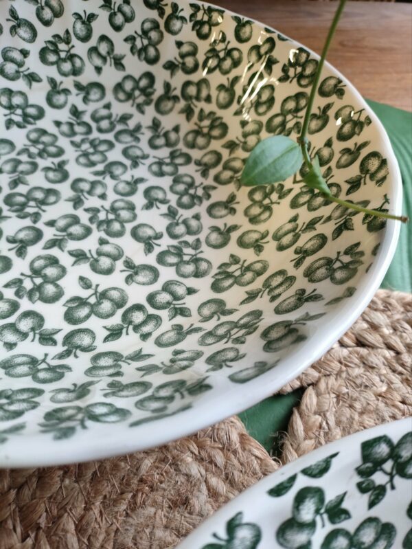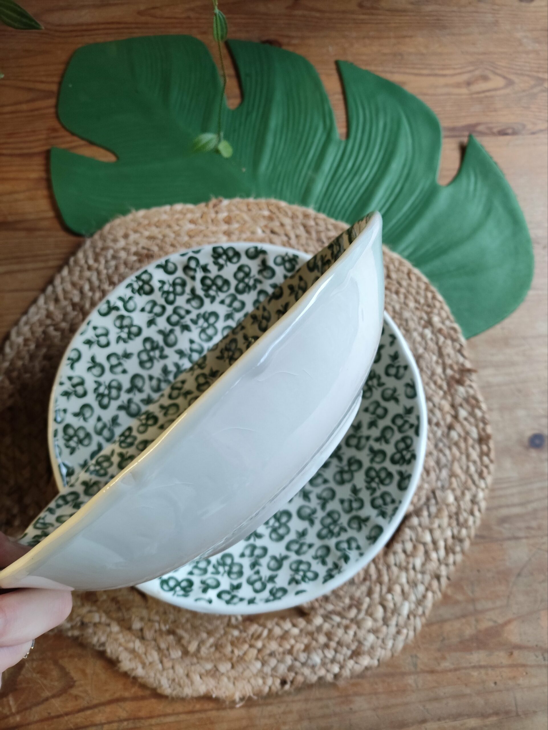 Duo de saladiers (taille assiette creuse) en céramique de couleur blanche avec un motif pommes vertes. Une jolie composition pour une touche de poésie sur votre table.