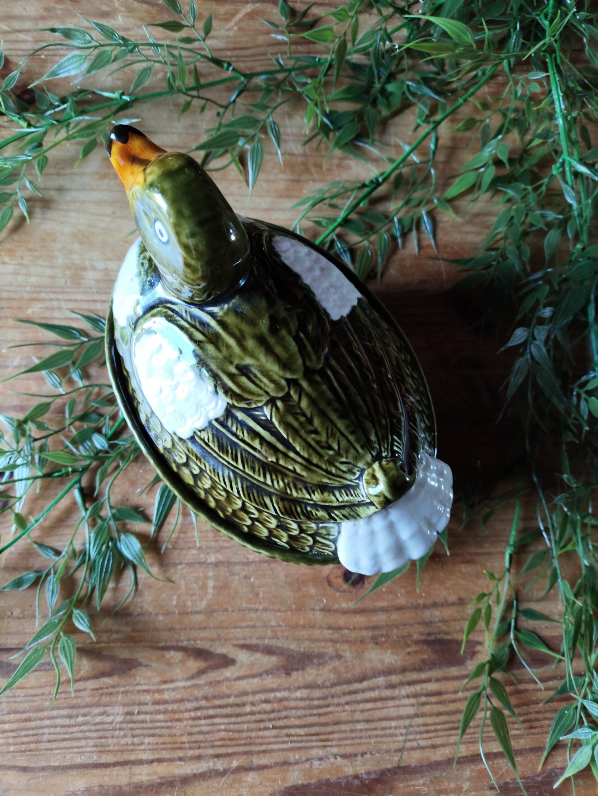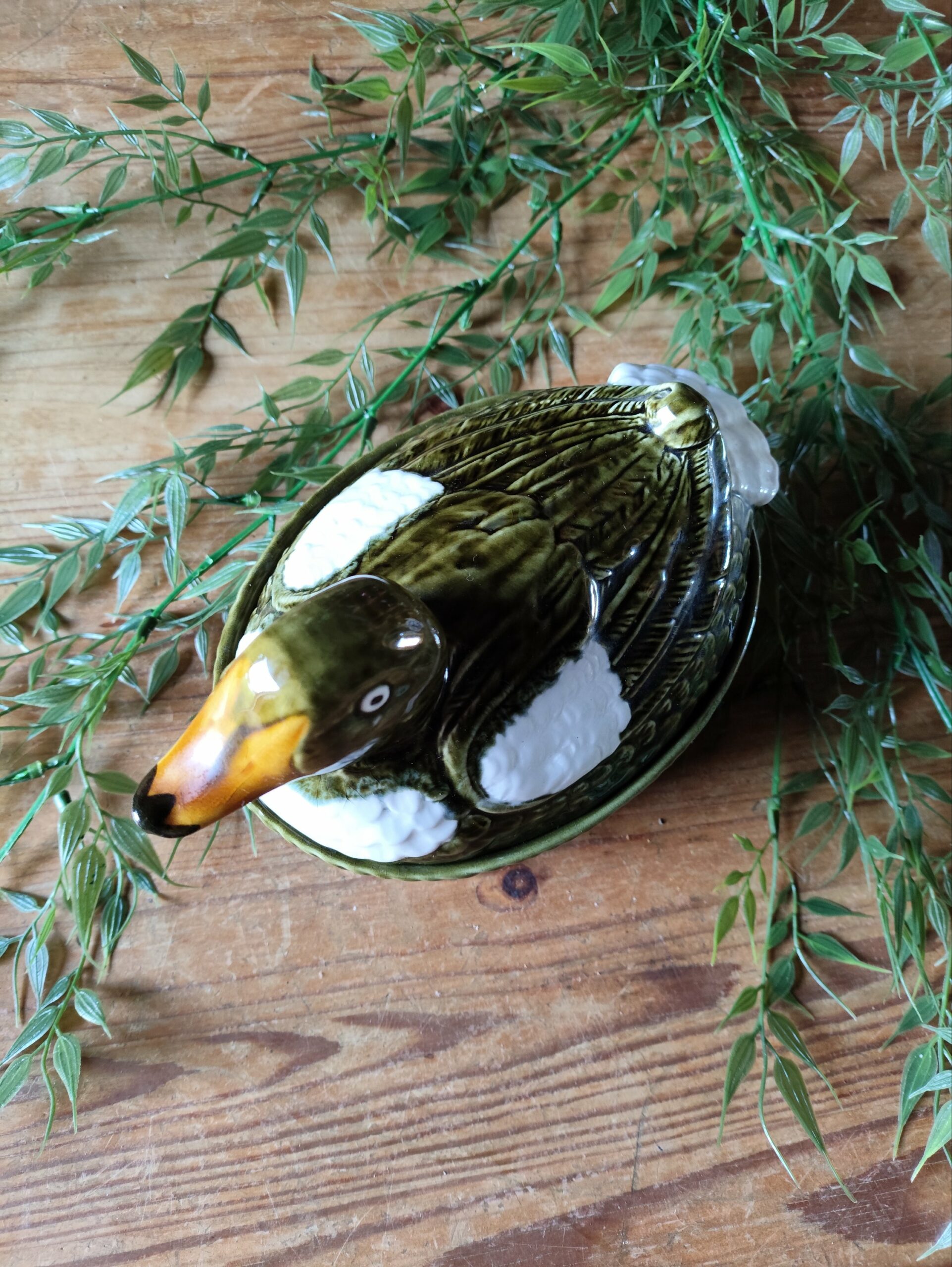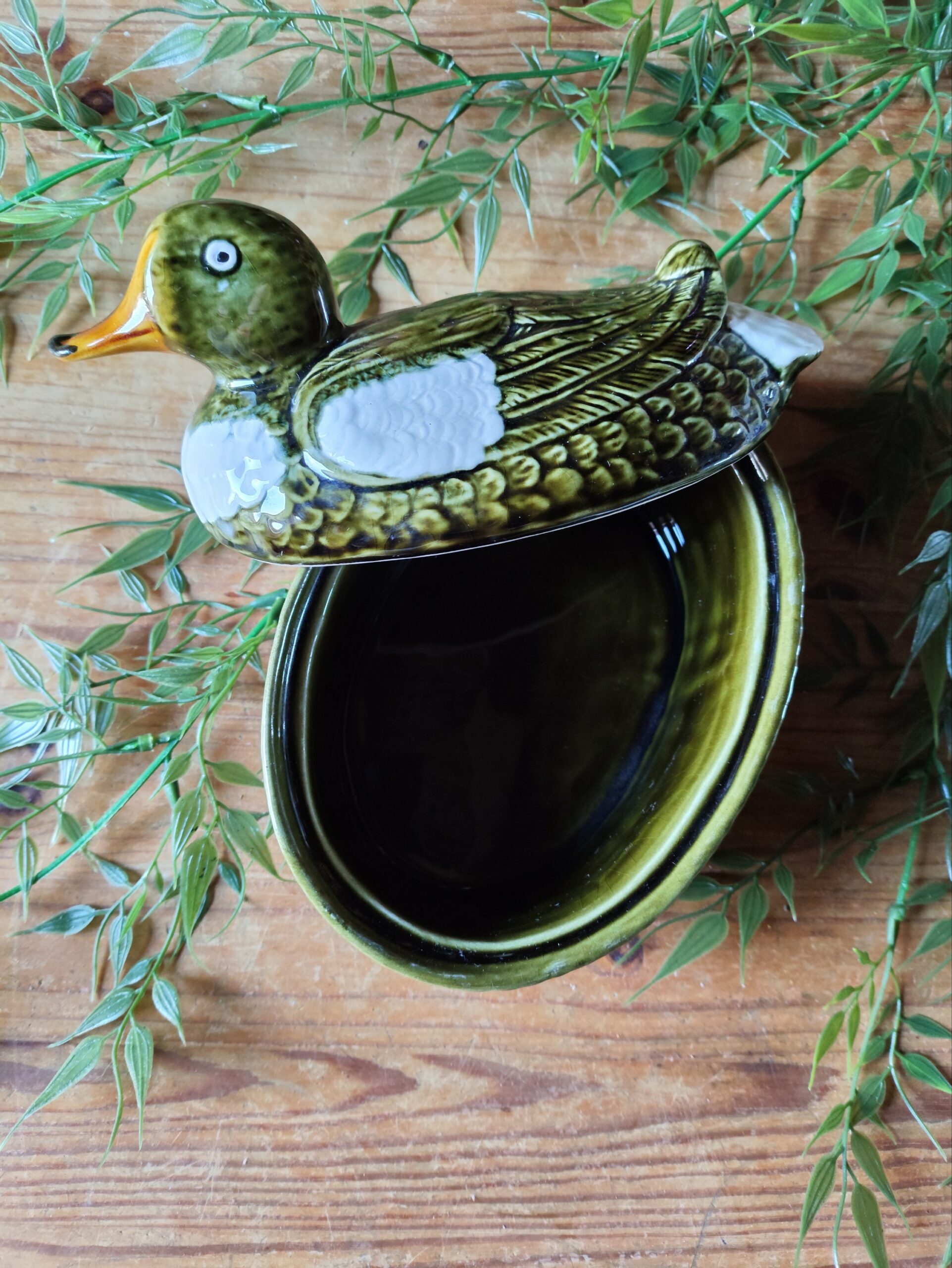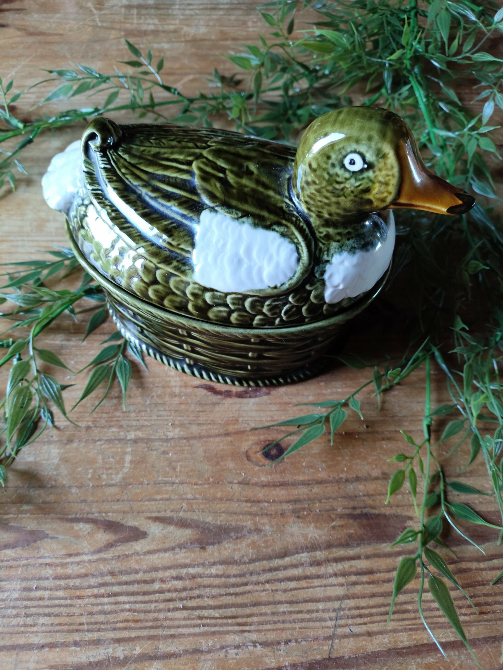 Terrine en forme de canard en céramique verte. Jolie pièce vintage pour une décoration pleine de charme.