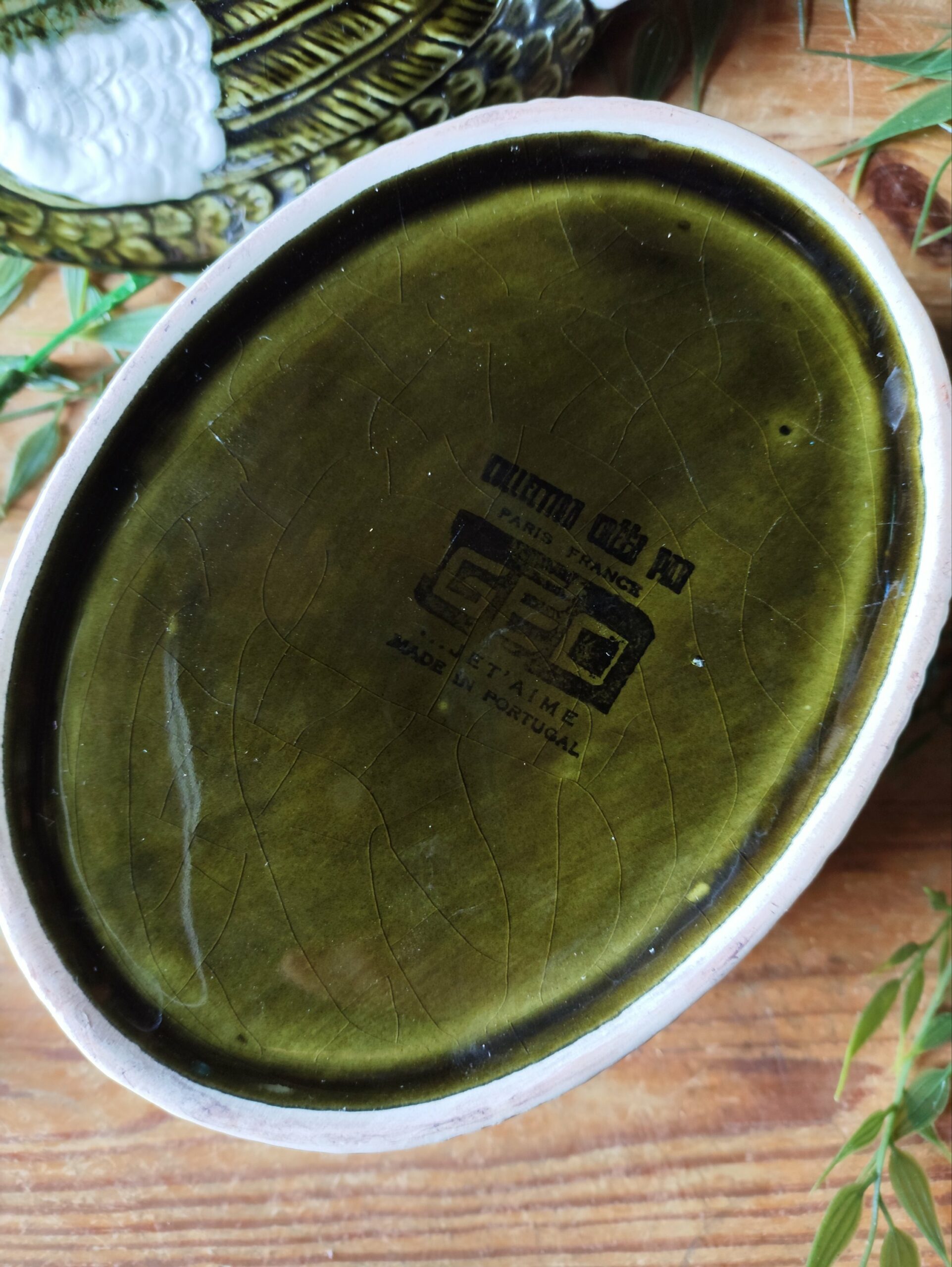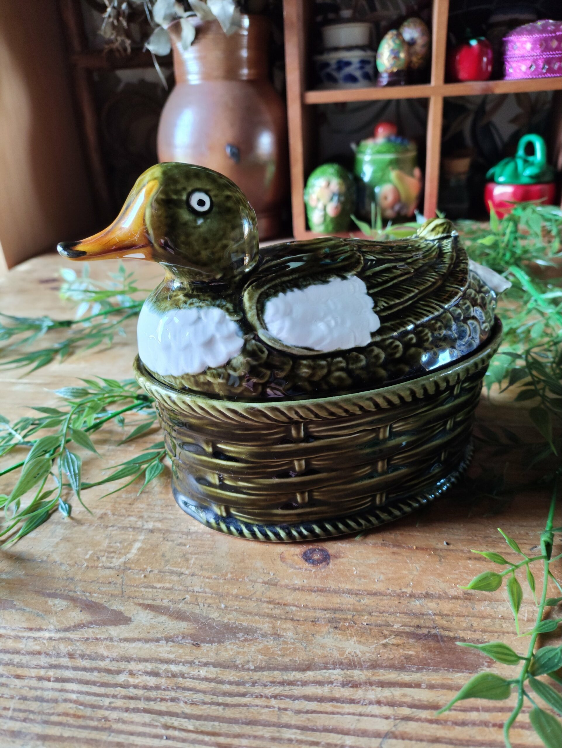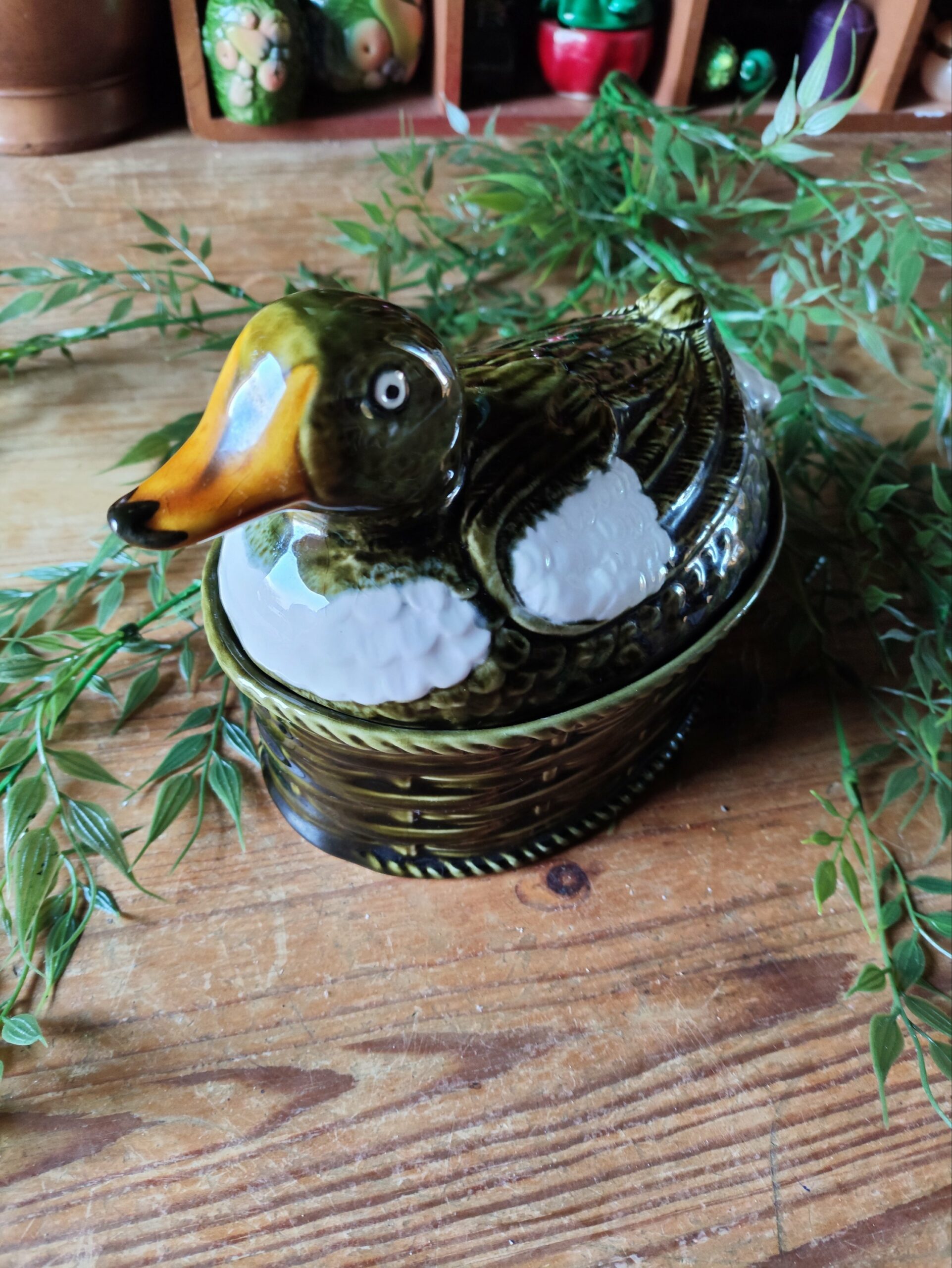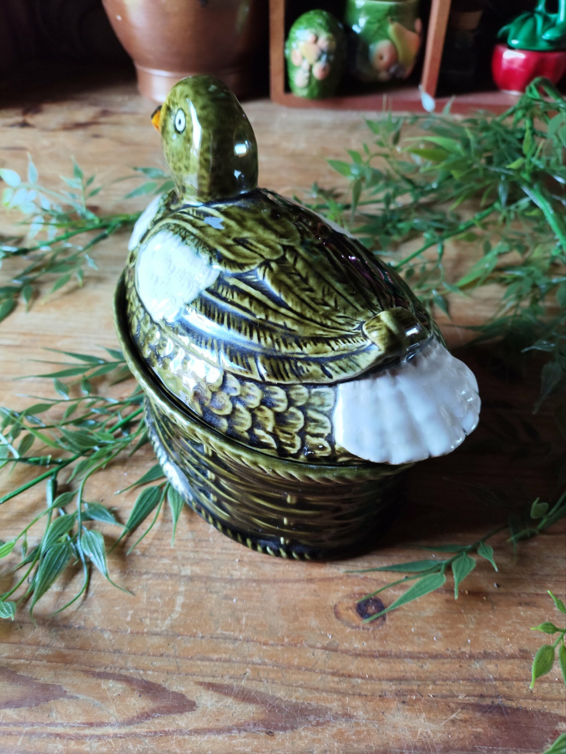 Terrine en forme de canard en céramique verte. Jolie pièce vintage pour une décoration pleine de charme.