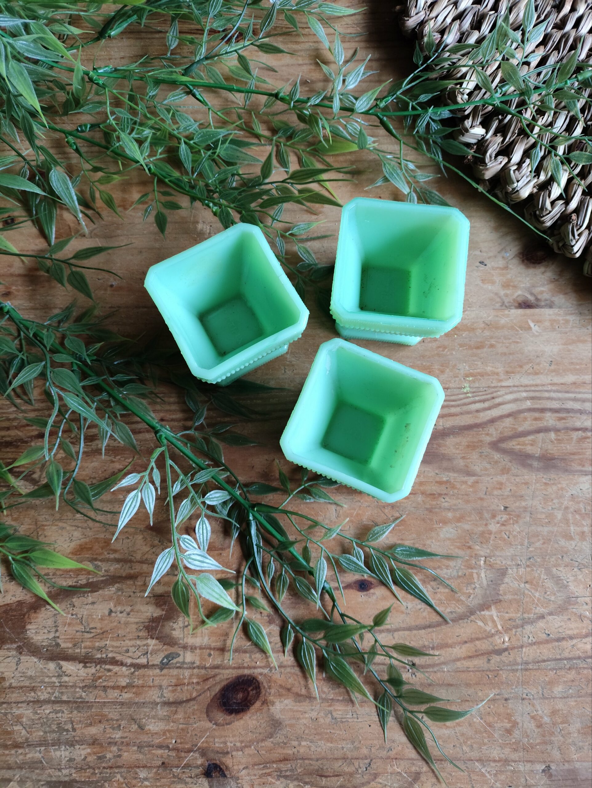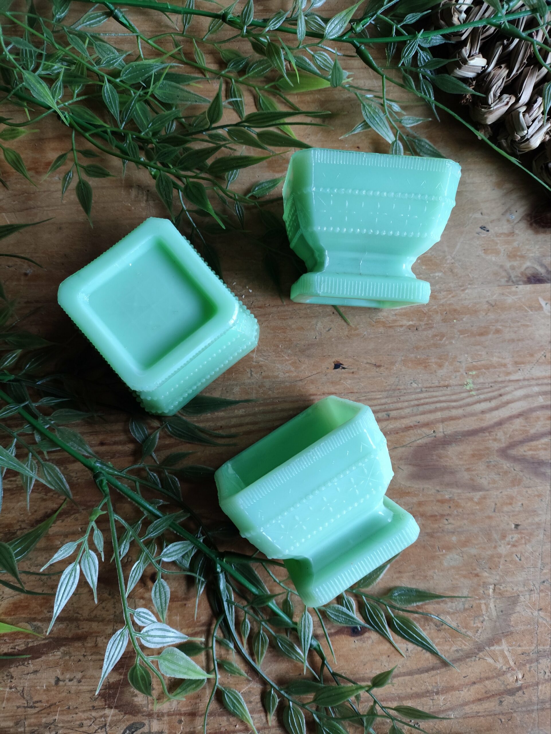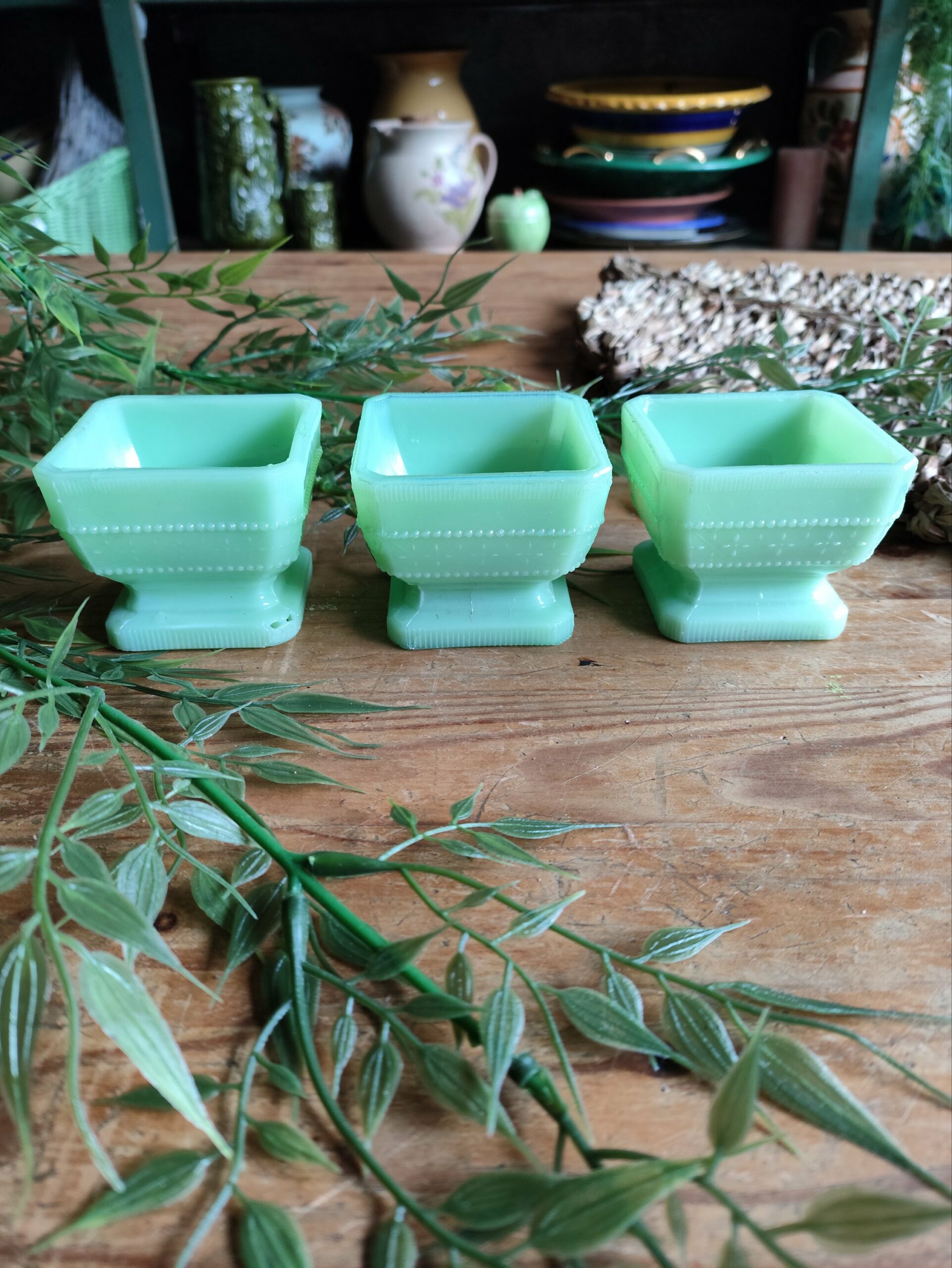 Trio de petites coupelles carrées en opaline de couleur verte. Objets anciens plein de charme.