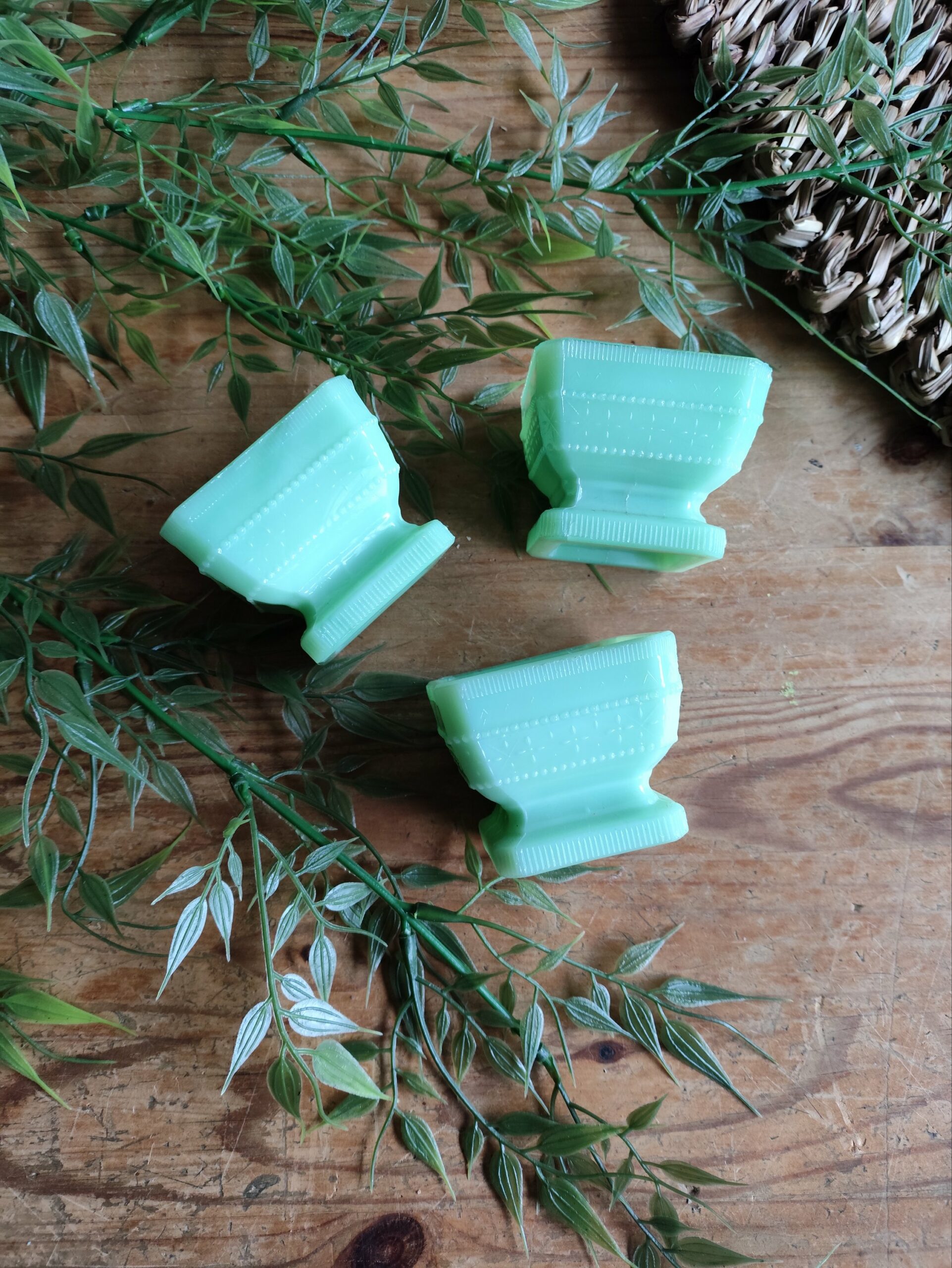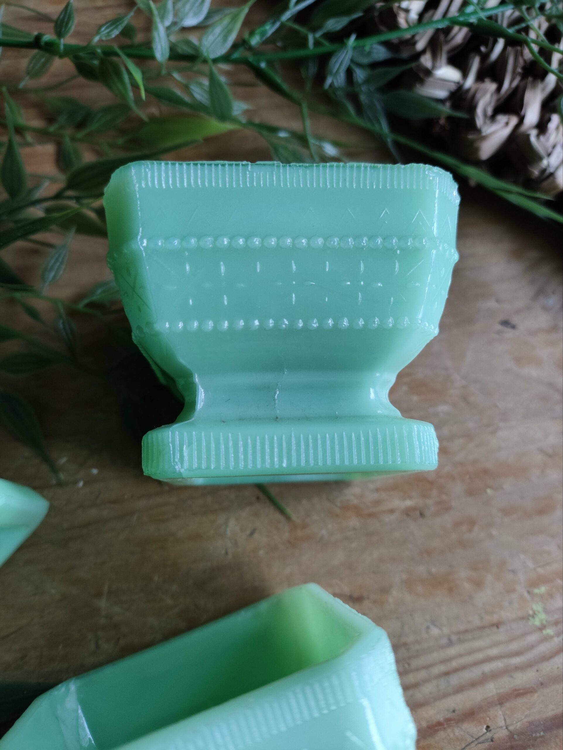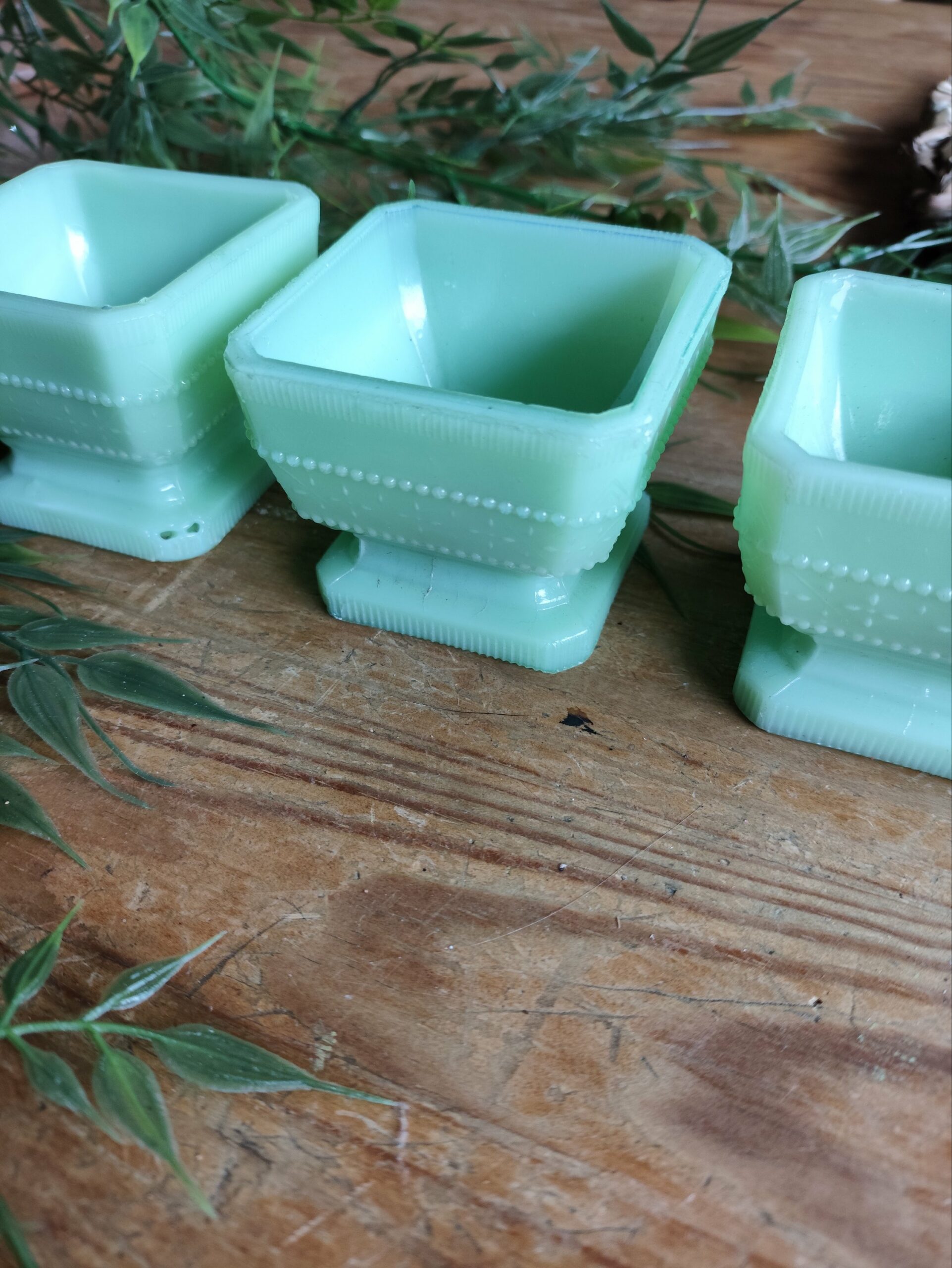 Trio de petites coupelles carrées en opaline de couleur verte. Objets anciens plein de charme.
